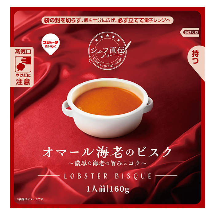 原材料 野菜(玉葱、人参、セロリ、にんにく)、牛乳(国内製造)、乳製品、トマトペースト、油脂加工食品(食用油脂、還元水飴、その他)、オマールえびエキス、オマールえび(頭肉)、ブランデー、でん粉分解物、白身魚エキス、えび風味エキス、ミルポワペースト、小麦粉、シーズニングオイル、寒天、酵母エキス、砂糖、セロリエキス、香辛料、食塩/調味料(アミノ酸等)、安定剤(大豆多糖類)、増粘多糖類、香料、カゼインNa、リン酸塩(Na)、pH調整剤、乳化剤、トマト色素、(一部にえび・かに・小麦・乳成分・さけ・大豆・鶏肉を含む)