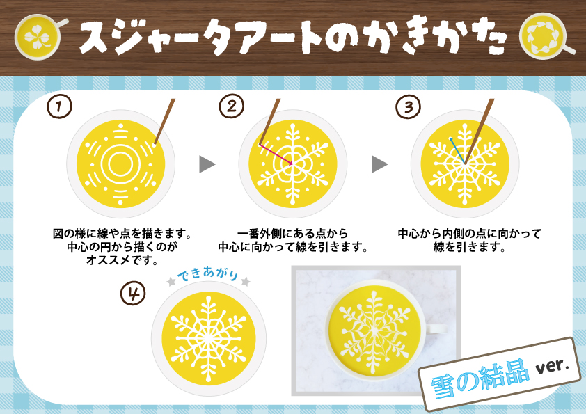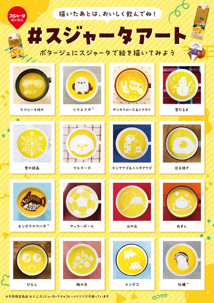 パンプキンクリームポタージュとスジャータを使って自由に絵や文字を描いてオリジナルスジャータアートを作りましょう✨