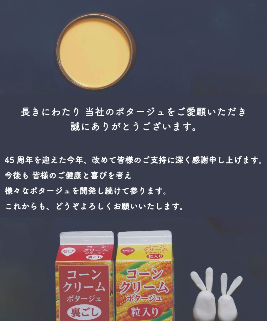 スジャータのコーンポタージュは、1981年の発売以来、皆様にご愛顧をいただき、今年発売45周年を迎えることができました。